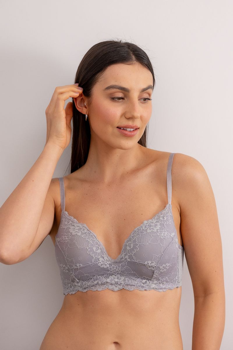 Sutiã rendado com bojo amplo e profundo, que modela os seios sem aumentar. Taças revestidas por renda. As laterais em tecido possuem barbatanas que ajudam a dar firmeza ao sutiã. Alças elásticas ajustáveis. Para os tamanhos 46 e 48 as alças são mais largas. Fecho com tripla regulagem. Compatível com Extensor A.