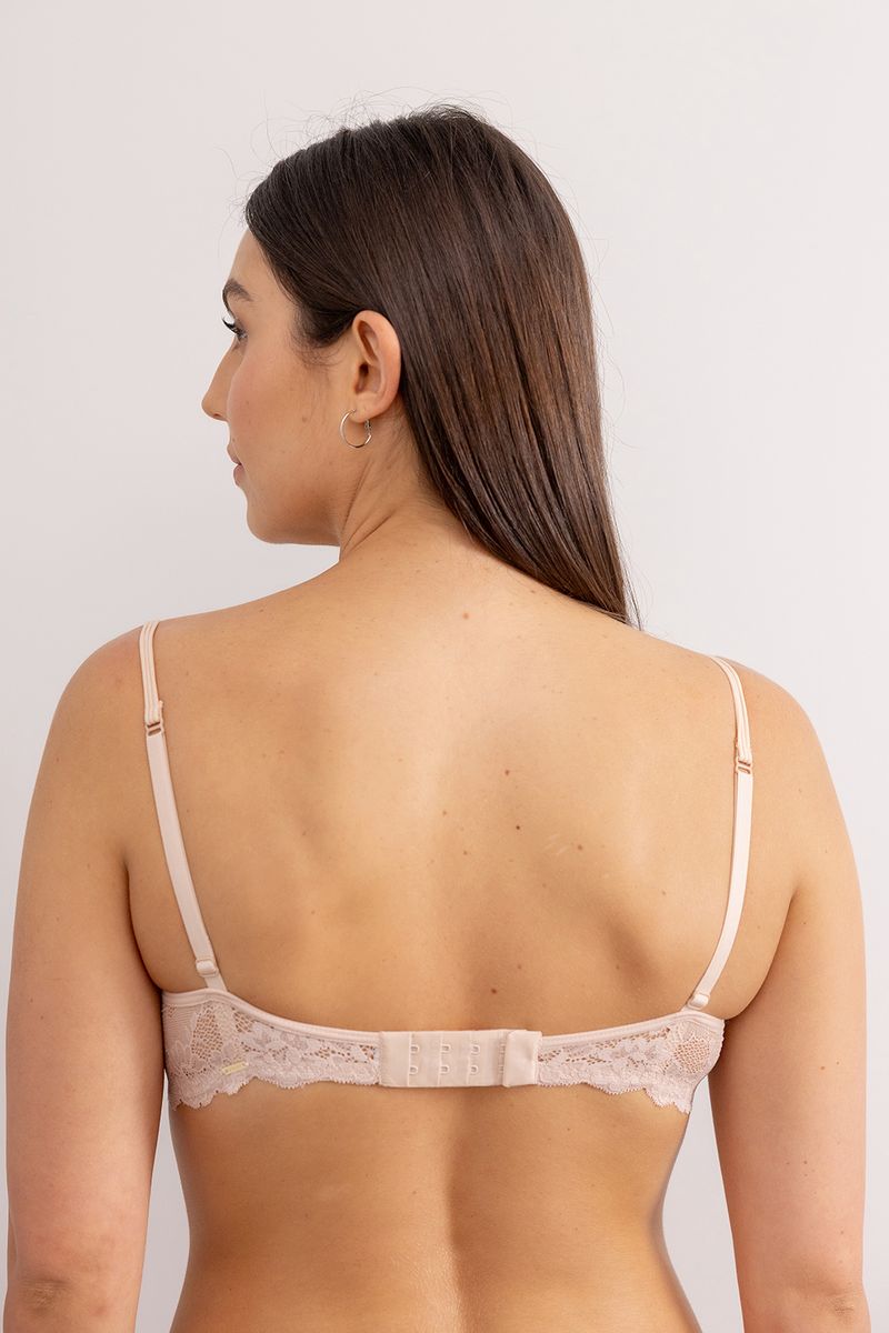 Sutiã com bojo básico revestido por renda. Base e costas em renda. Alças triplas fininhas na frente com parte de trás em elástico ajustável. Fecho com tripla regulagem. Compatível com Extensor A.